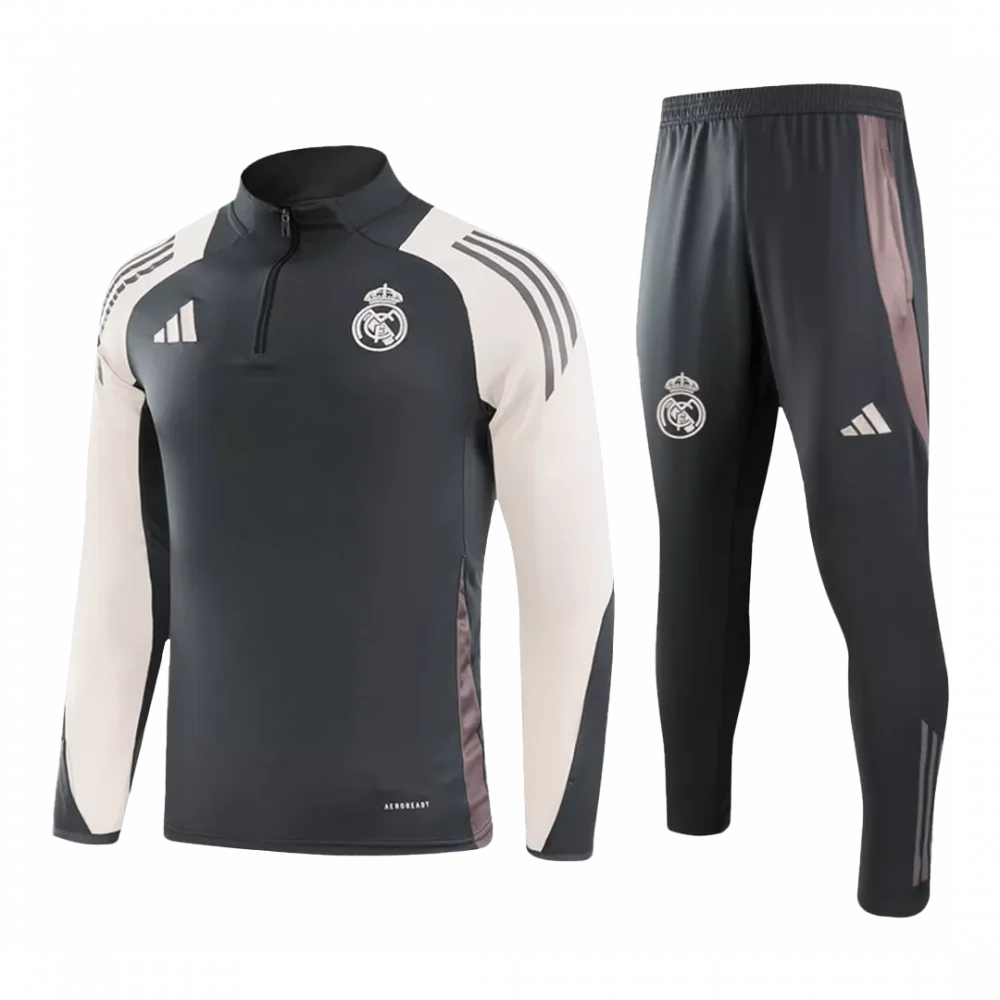 Step into the spirit of one of football’s greatest legends with the Real Madrid 1/4 Zip Tracksuit in sleek gray. Featuring a modern contrast of dark gray and creamy white panels, this design honors the club’s timeless elegance and relentless pursuit of excellence. The subtle details, including the iconic crest and streamlined stripes, capture the pride and tradition that have defined Real Madrid’s historic journey.
