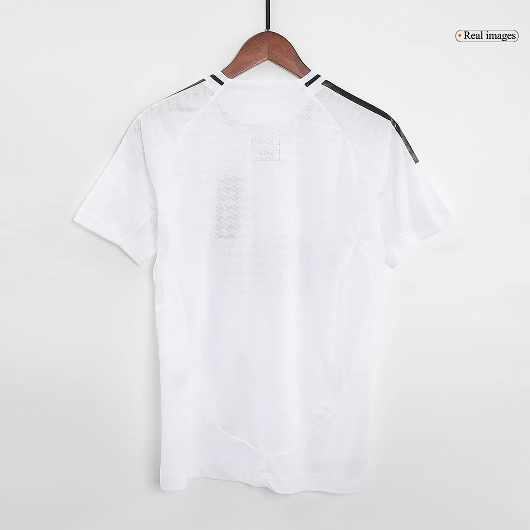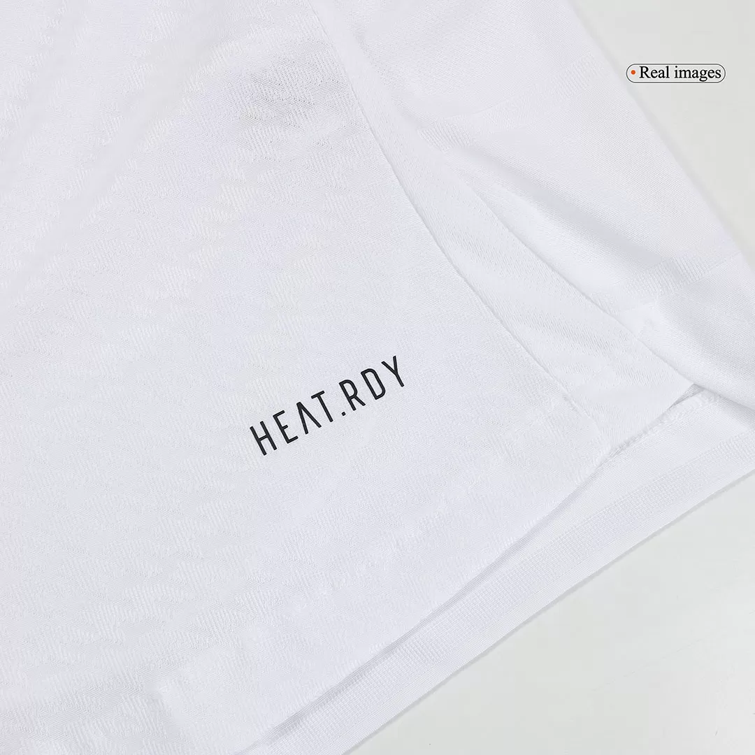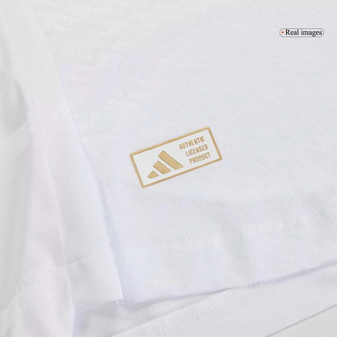 Step onto the pitch like the legends of Real Madrid with this Home Authentic Full Kit. Featuring a pristine white jersey accented with subtle black details and the iconic club crest crowned in gold, it embodies the elegance and winning spirit of a team with a rich history of excellence. Designed for peak performance, the kit offers lightweight, breathable fabric with advanced moisture-wicking to keep you cool and comfortable from kickoff to the final whistle.