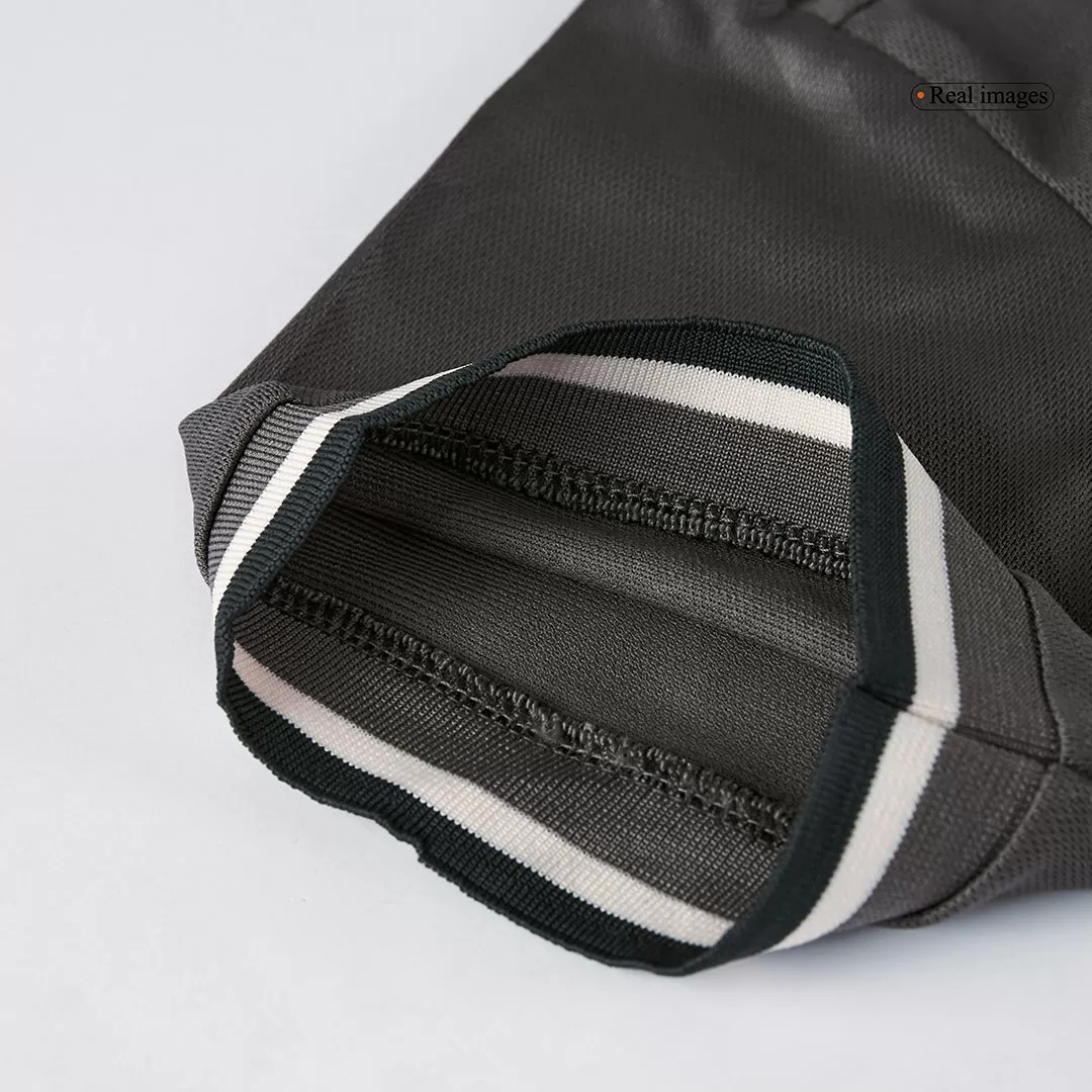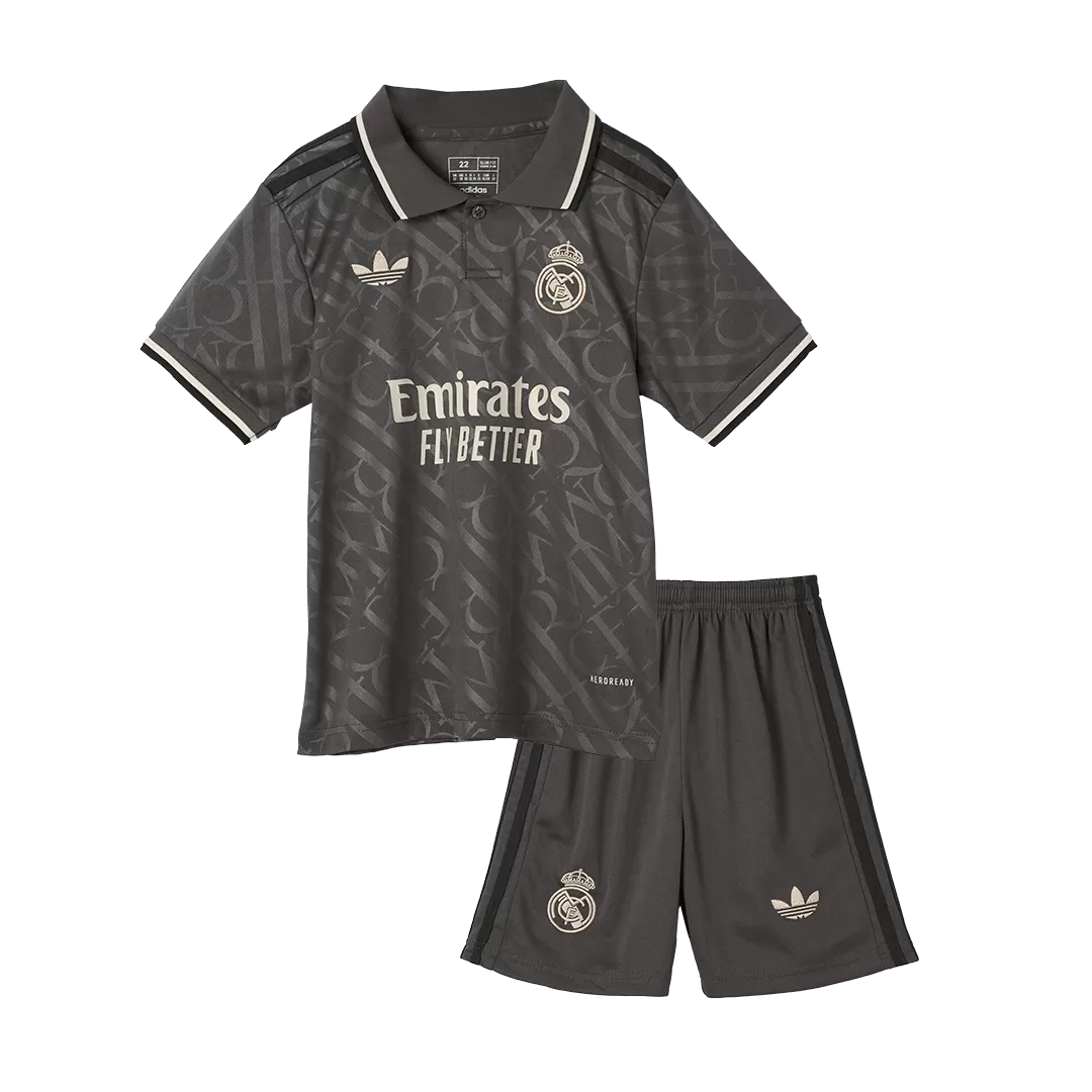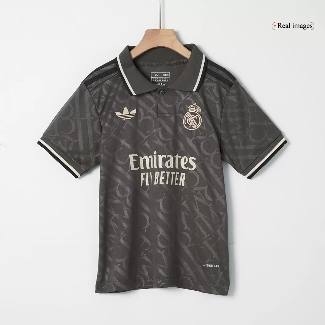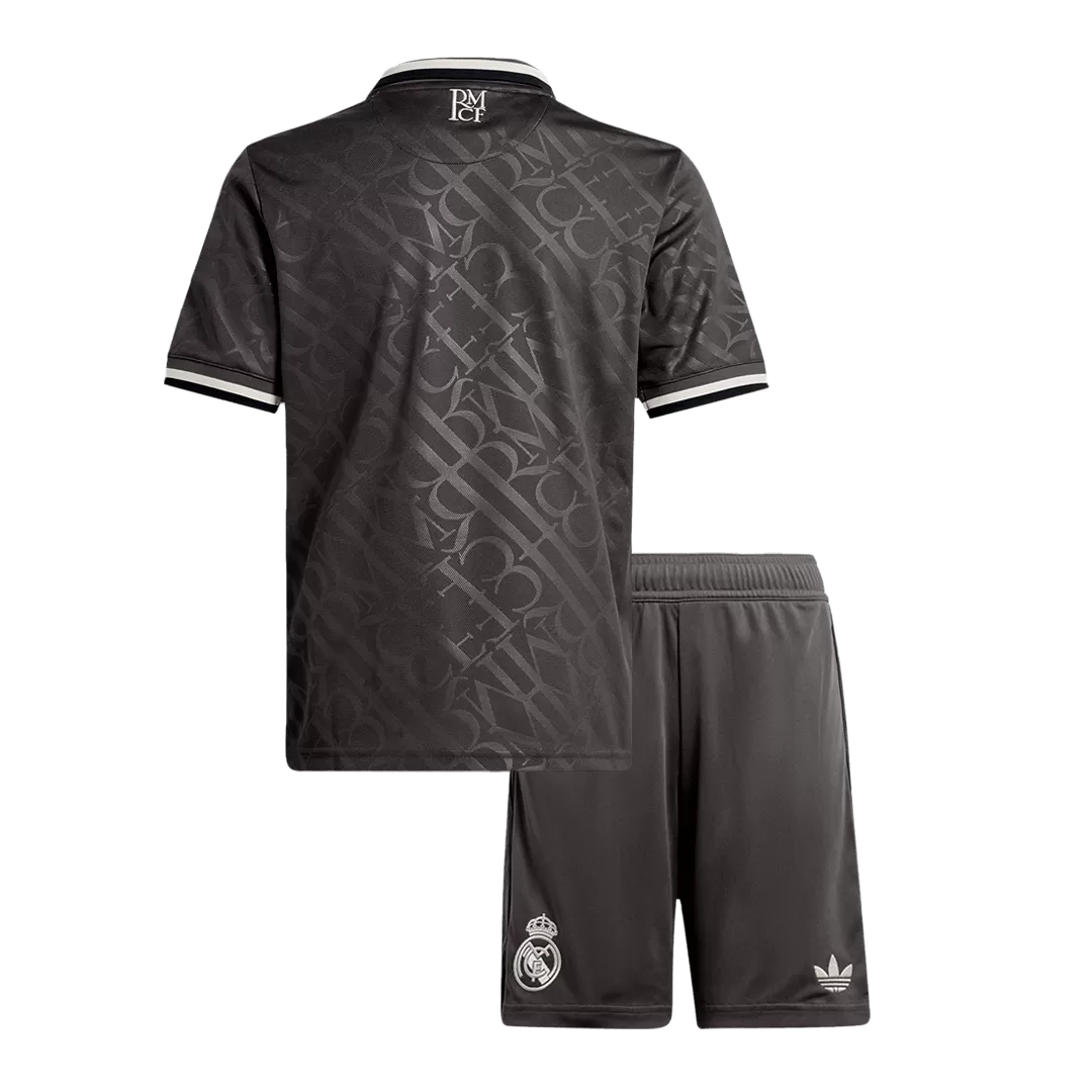 Step into the legacy of one of football’s greatest with the Real Madrid Third Away Kids Soccer Jerseys Kit. This sleek, dark charcoal kit features a subtle tonal pattern that echoes the club’s rich heritage, paired with clean white accents on the collar and cuffs for a sharp, modern look. Perfect for young fans ready to embrace the spirit of Los Blancos, this kit combines timeless style with high-performance details to keep kids comfortable and confident on the pitch.