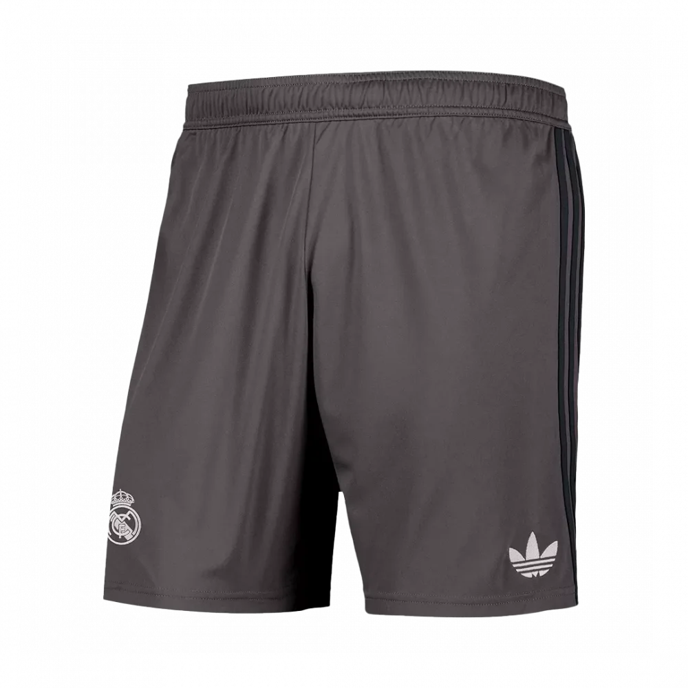 Step into the game with the Real Madrid Third Away Soccer Shorts, designed in a sleek, dark charcoal tone complemented by subtle black side stripes for a modern, stealthy look. Honoring the club’s legendary status and relentless pursuit of excellence, these shorts embody the spirit of champions ready to conquer any pitch. Engineered with breathable, lightweight fabric and advanced moisture-wicking features, they keep you cool and comfortable during every play.