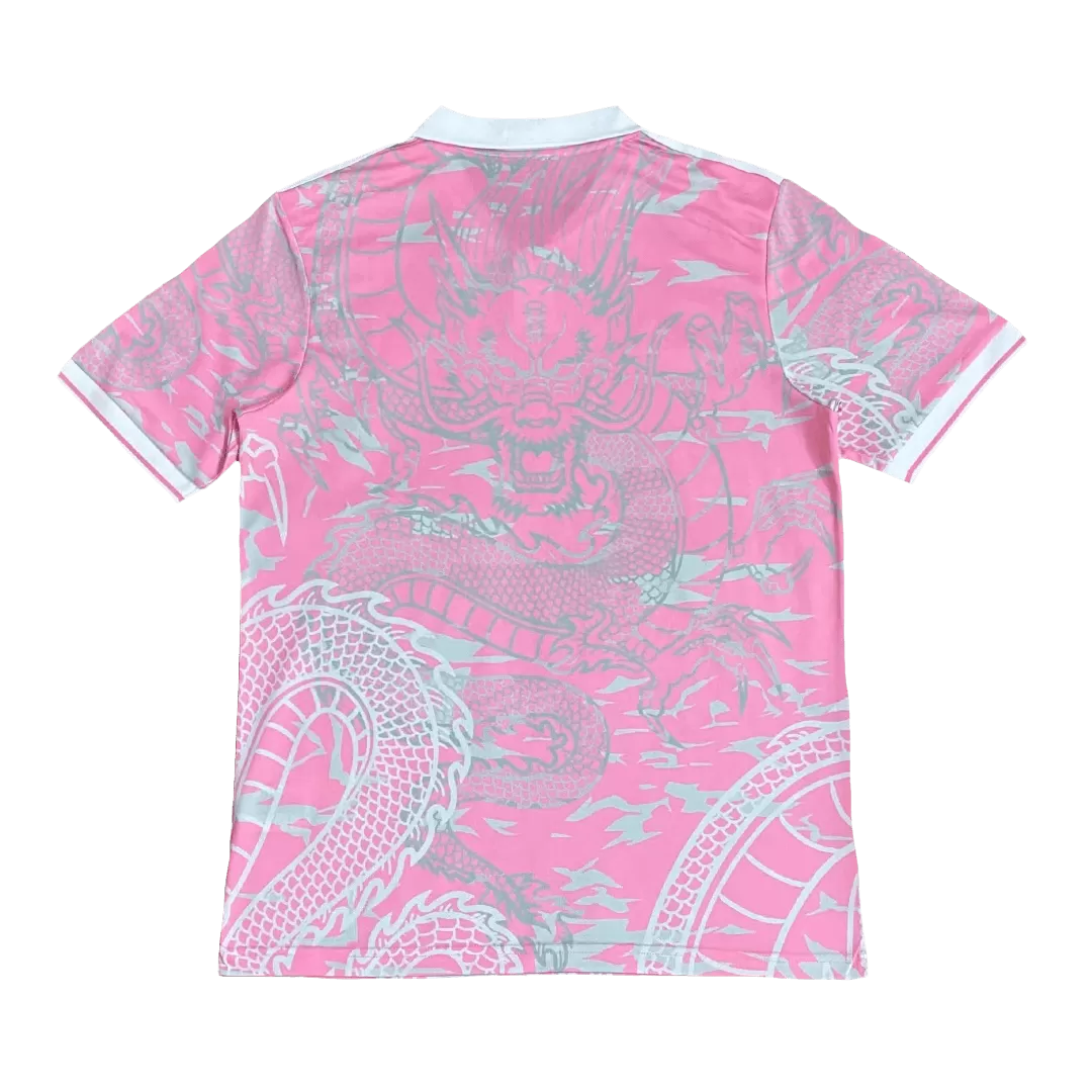 Unleash bold style and fierce spirit with the Real Madrid x Chinese Dragon Soccer Jersey 2023/24 in striking pink. Featuring an intricate silver dragon motif that symbolizes strength and power, this jersey brings a unique cultural flair to the classic Real Madrid heritage. The crisp white collar and sleeve accents add a sharp contrast, embracing both tradition and innovation on the pitch.