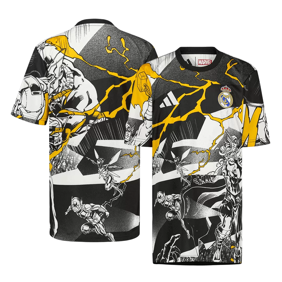 Unleash the power of legends with the Real Madrid X Marvel Jersey 2025/26 Black & White. This dynamic design fuses the iconic Real Madrid heritage with striking Marvel superhero artistry, featuring bold black and white contrasts accented by vivid yellow lightning bolts that electrify the look. Celebrating both football greatness and heroic feats, this jersey symbolizes strength and unity on and off the pitch.