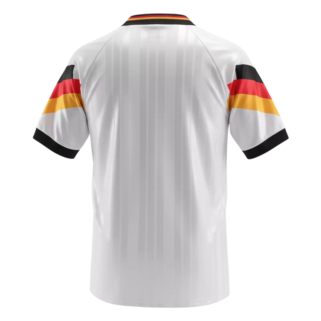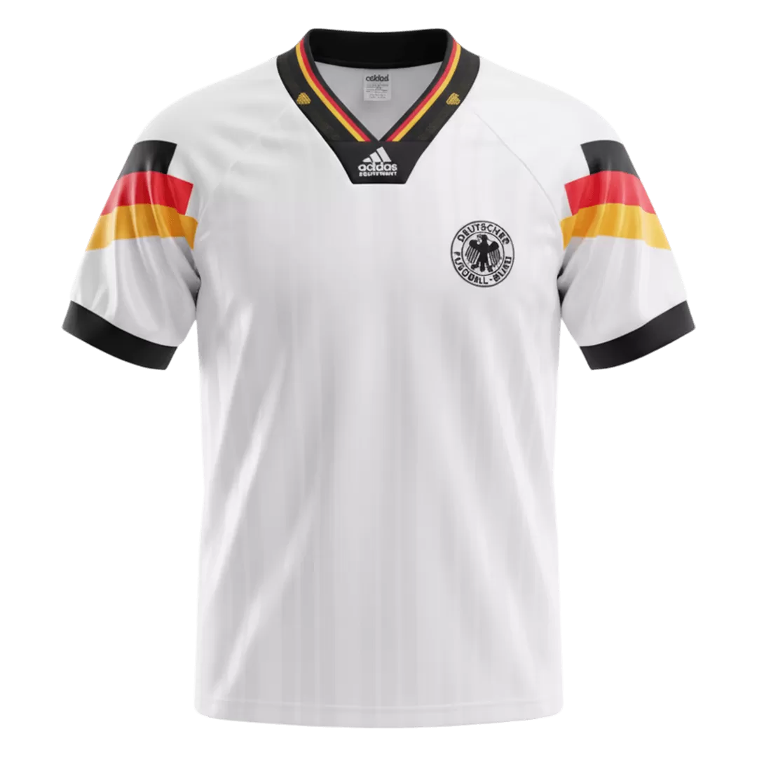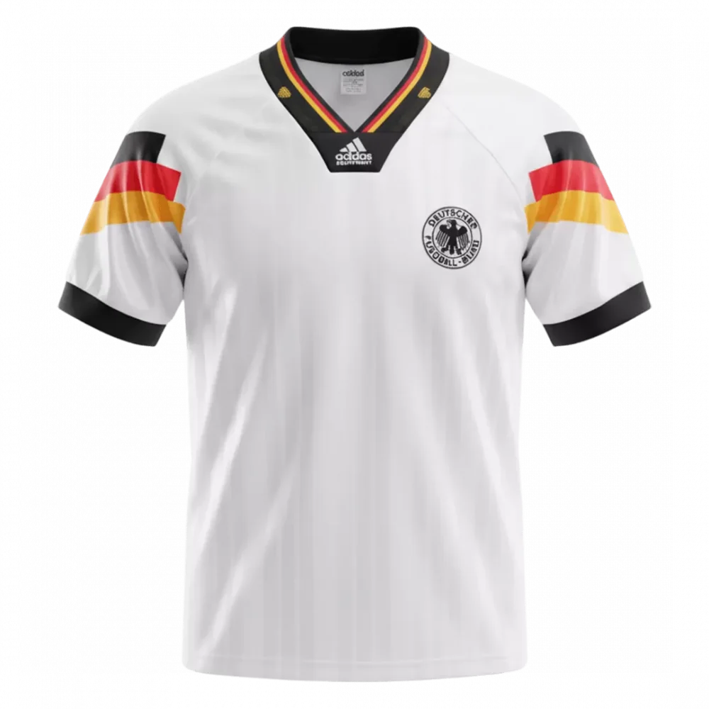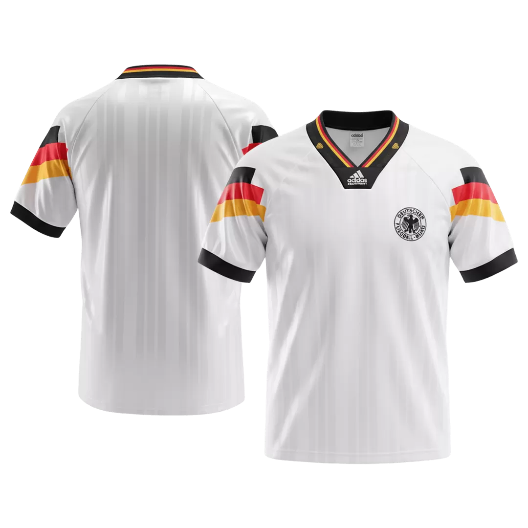 Step into football history with the Retro Soccer Jersey Germany Home 1992, a classic tribute to one of the most iconic eras of German soccer. Featuring a clean white base accented by bold black, red, and golden yellow stripes on the sleeves and collar, this jersey perfectly captures the spirit and pride of Germany’s legendary 1992 squad. The vintage emblem on the chest further enhances its timeless appeal, connecting fans to the tradition and resilience the team is known for.