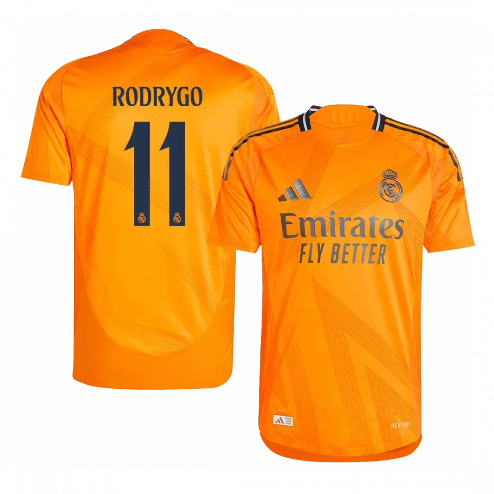 Command attention in the Real Madrid Away Kit, where vibrant orange pulses with subtle geometric patterns that echo the club’s relentless energy and ambition. Featuring Rodrygo’s name and number 11 in bold navy, this jersey is a tribute to the young star’s flair and the rich legacy of Los Blancos, champions who always fly higher.