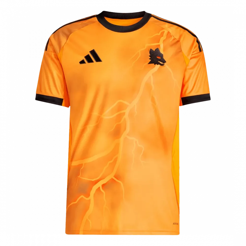 Unleash the thunder with the Roma Away Soccer Jersey 2025/26. This vibrant orange kit pulses with energy, featuring striking lightning bolt patterns that embody the fierce spirit and relentless drive of AS Roma. With bold black accents framing the sleeves, collar, and iconic wolf crest, this jersey honors the club’s legendary heritage rooted in strength and passion.
