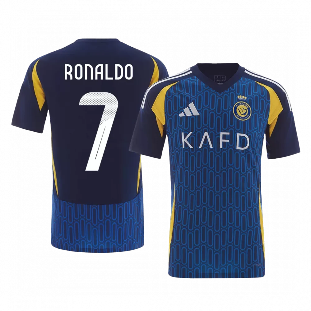 Step onto the pitch with the RONALDO #7 Al Nassr Away Soccer Jersey, a bold tribute to the club’s rich legacy and unstoppable spirit. Featuring a dynamic interplay of deep navy and vibrant gold, this jersey showcases a modern geometric pattern that symbolizes unity and strength. Embrace the power of a design inspired by Al Nassr’s historic quest for glory, while enjoying top-tier comfort that keeps you cool and focused throughout the game.