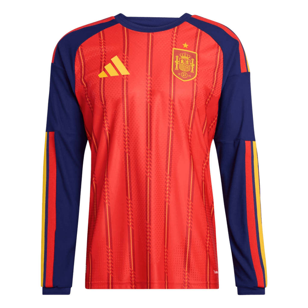Step into the legacy of La Roja with the Spain Home Long Sleeve Player Version Jersey for the 2026 World Cup. Featuring a bold red base with intricate vertical patterns and striking navy sleeves accented by red and yellow stripes, this jersey embodies the passion and pride of Spanish football, celebrating decades of creativity and skill on the world stage. Designed for peak performance, it combines breathable, lightweight fabric with advanced moisture-wicking properties to keep you comfortable from kickoff to final whistle.