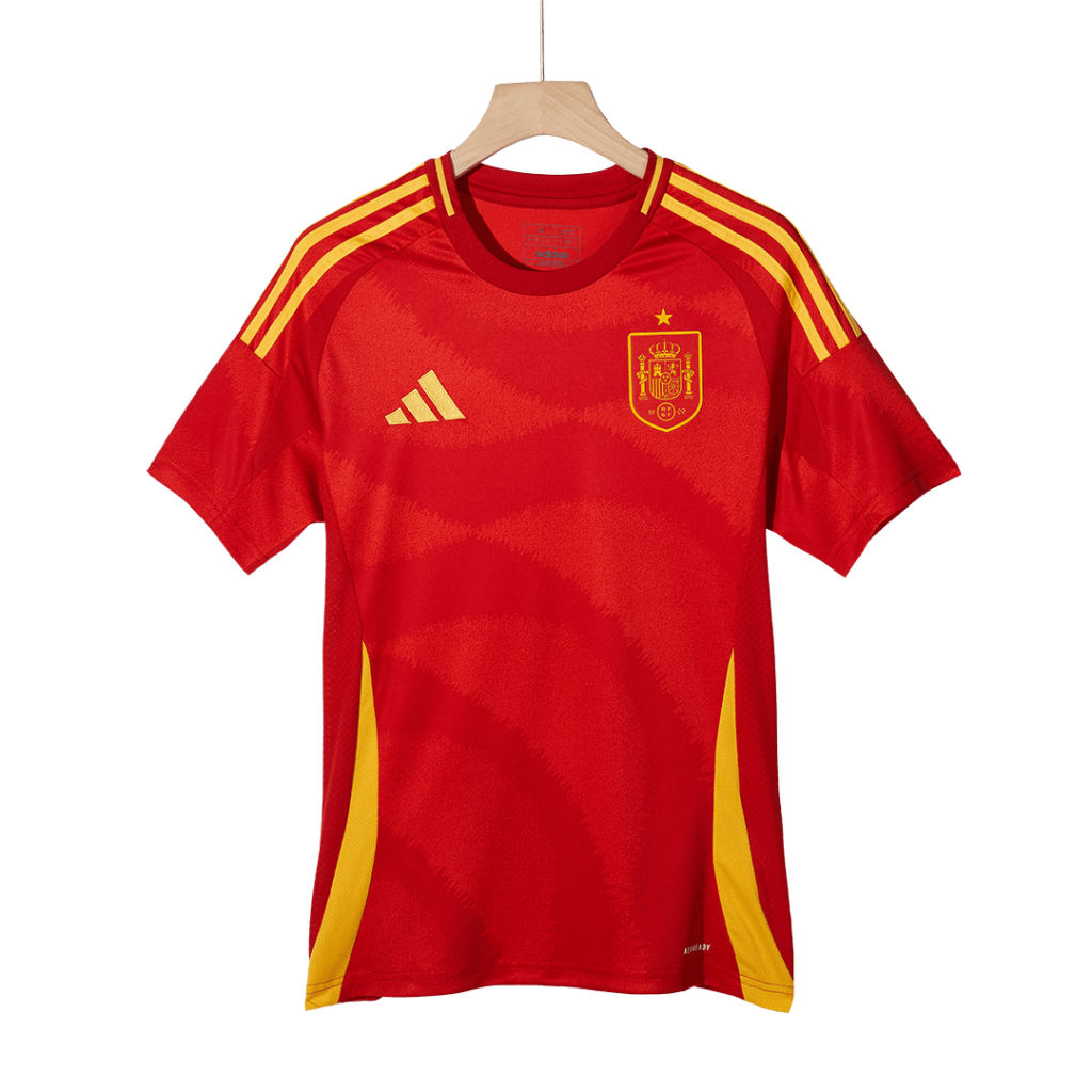 Ignite the passion of La Roja with the Spain Home Soccer Jersey EURO, featuring a vibrant red base accented by bold yellow stripes and subtle wave-like patterns that celebrate the fiery spirit and rich heritage of Spanish football. This jersey pays homage to Spain’s relentless pursuit of excellence and unity on the global stage, making every match an unforgettable display of pride.