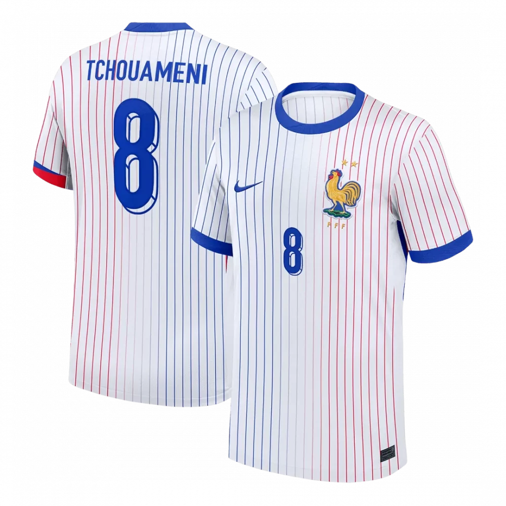Step into the legacy of French football with the TCHOUAMENI #8 France Away Soccer Jersey, showcasing a striking blend of red and blue pinstripes on a crisp white backdrop. This design pays homage to the nation’s iconic colors and proud history, featuring the classic rooster emblem—a symbol of French pride and resilience. Perfect for fans who want to display passion and performance, this jersey combines lightweight, breathable fabric with advanced moisture-wicking properties to keep you cool on and off the pitch.