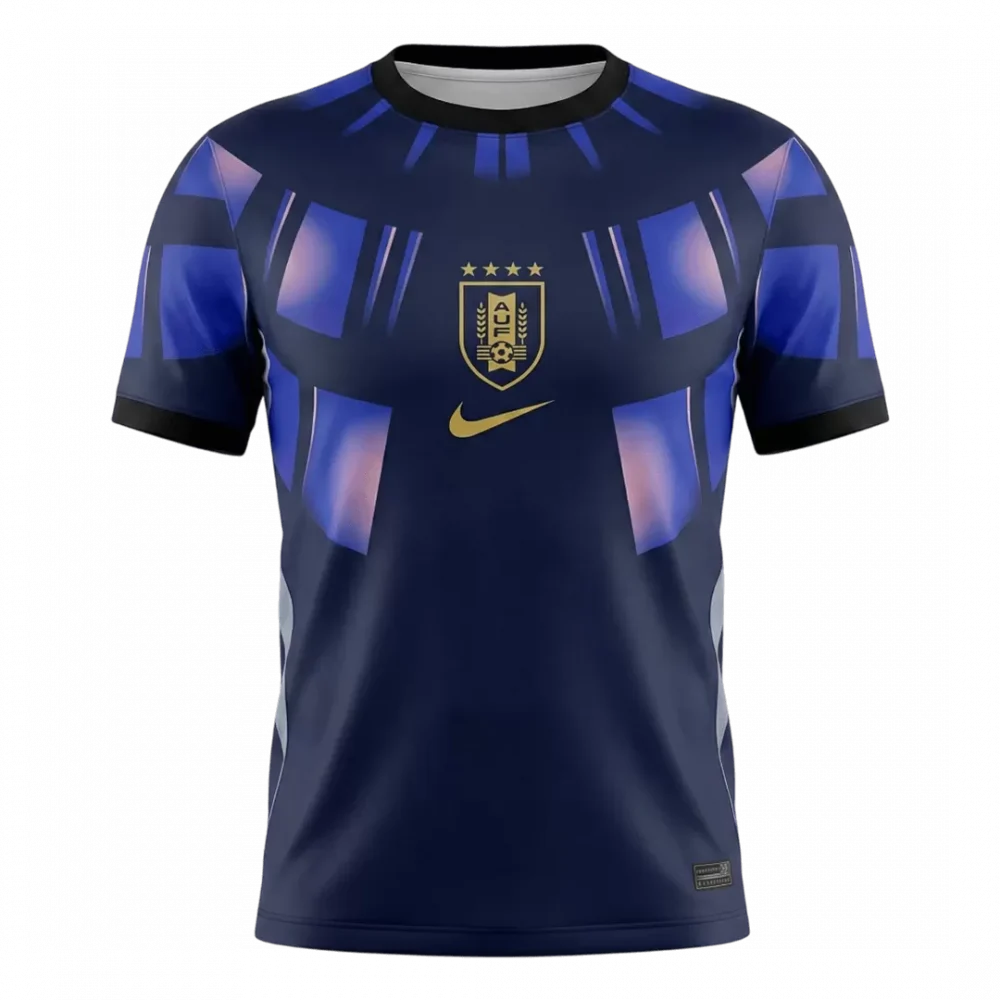Step into the future of Uruguayan football with the Uruguay Away Soccer Jersey for World Cup 2026. Featuring a striking deep navy base adorned with dynamic blue and purple geometric patterns across the chest and shoulders, this jersey captures both modern energy and the proud legacy of La Celeste. The golden crest and subtle black accents honor Uruguay’s rich history of passion and excellence on the world stage. Designed for peak performance, it offers breathable, moisture-wicking fabric to keep players cool and comfortable throughout the match.