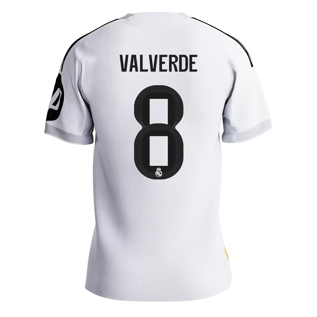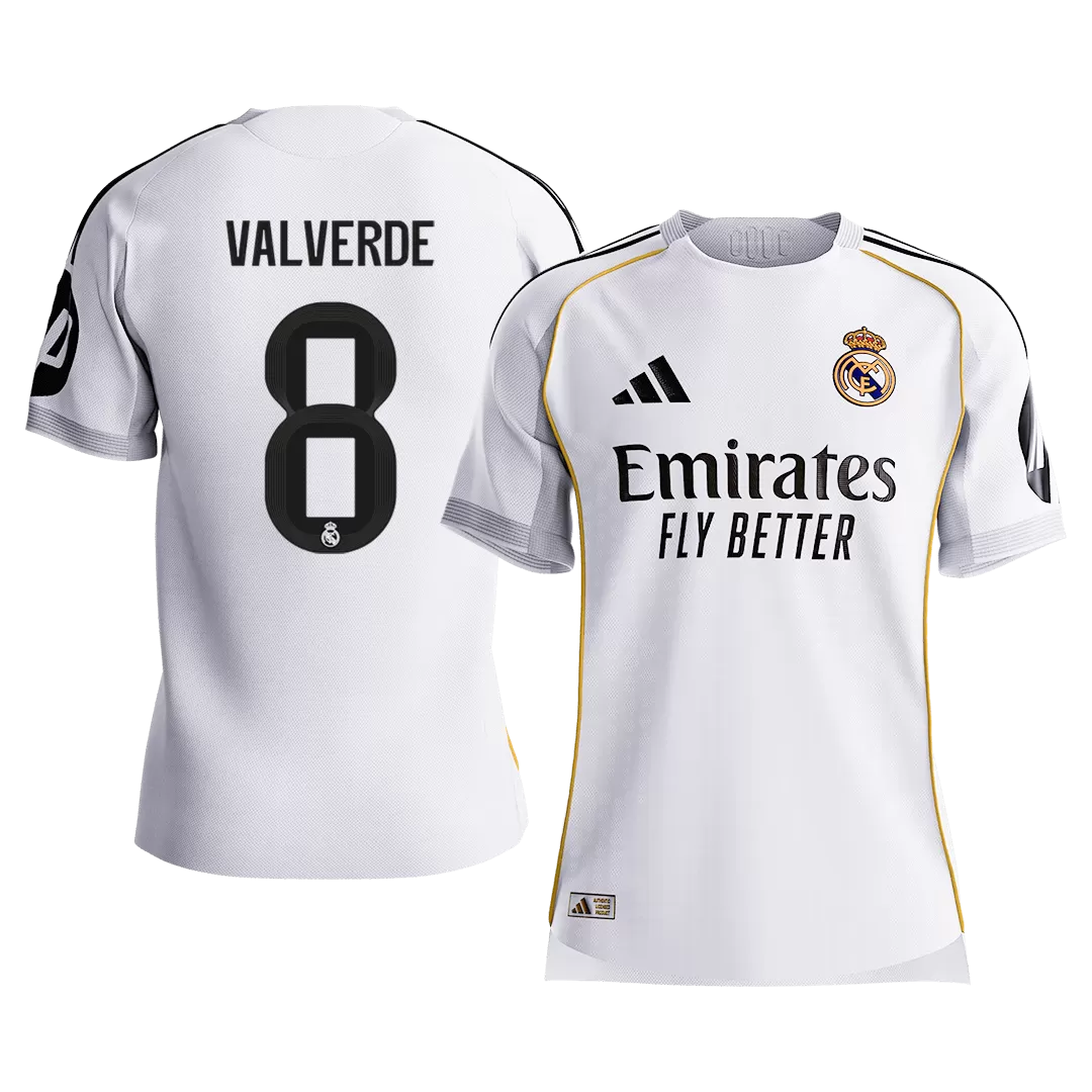 Step into greatness with the VALVERDE #8 Real Madrid Home Authentic Soccer Jersey 2025/26. This iconic white jersey is accented by subtle gold piping along the shoulders and sides, reflecting the club’s timeless elegance and legendary history. A tribute to Real Madrid’s relentless pursuit of excellence, this jersey blends tradition with modern performance, designed to keep you cool and comfortable on and off the pitch.