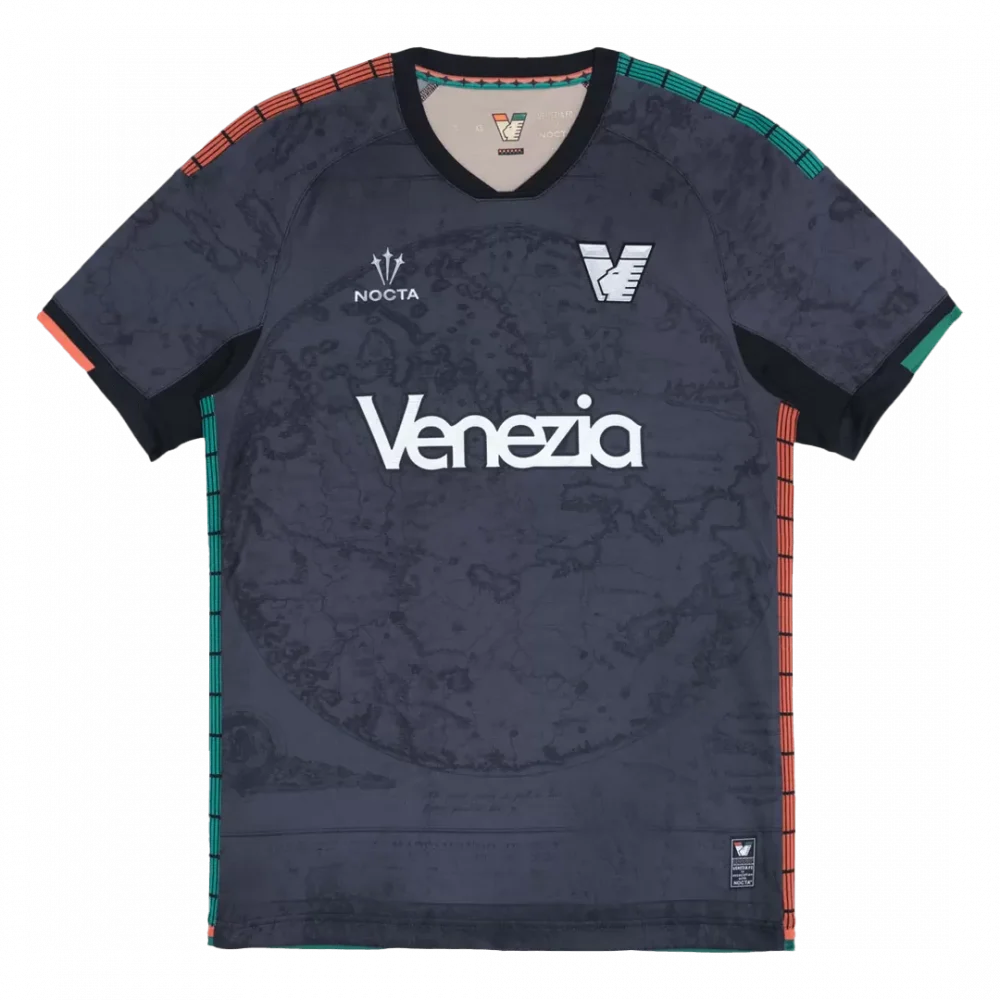 Step into the future with the Venezia FC Home Soccer Jersey 2025/26, where tradition meets innovation. This striking dark jersey features an intricate map-inspired pattern that pays homage to Venice’s rich maritime history, framed by bold orange and teal accents that symbolize the city’s vibrant spirit. The sleek V-neck design and subtle details reflect Venezia FC’s unique identity and passion for the game.