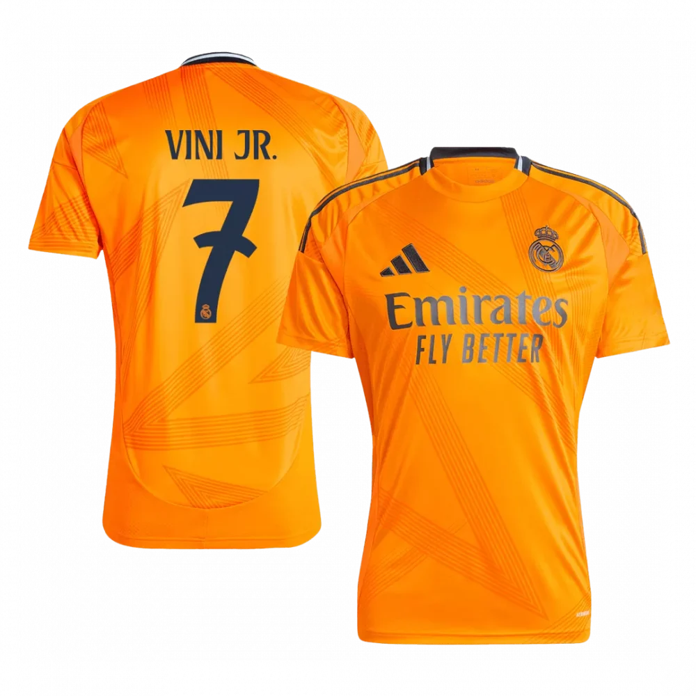 Step onto the pitch with the dazzling energy of the VINI JR. #7 Real Madrid Away Soccer Jersey. This vibrant orange kit features subtle geometric patterns that bring a modern edge while proudly showcasing the legendary club crest and iconic number 7, honoring one of Madrid’s most exciting talents. A tribute to Real Madrid’s relentless spirit, this jersey combines bold design with cutting-edge comfort to inspire every performance.