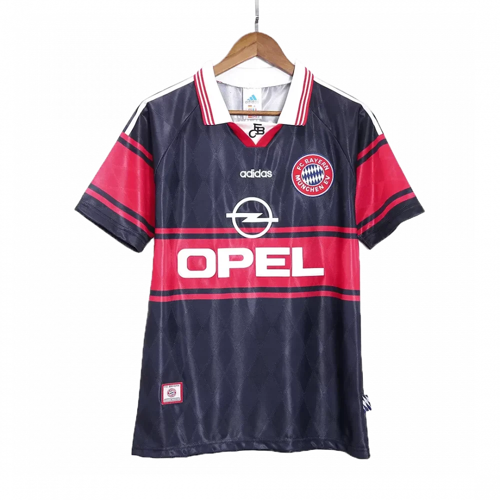 Step back into a golden era of German football with the Vintage Bayern Munich Home Jersey from 1997 to 1999. This iconic design features a striking deep navy base accented by bold red stripes across the chest and sleeves, topped off with a classic white collar and subtle diamond patterns woven into the fabric—a true symbol of Bayern’s relentless spirit and championship pedigree. Whether you’re a longtime fan or a collector, this jersey perfectly captures the club’s tradition and on-field excellence.