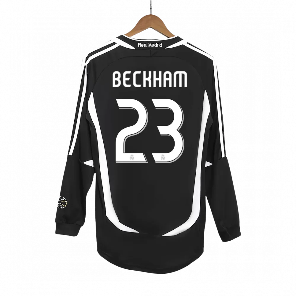 Step back into the 2006/07 season with this vintage Real Madrid away jersey, famously worn by Beckham. Featuring a sleek black base with striking white accents along the sleeves and sides, this long-sleeve design captures the elegance and determination that have defined one of football’s most storied clubs. Celebrating Beckham’s iconic number 23, this jersey is a true nod to an era when skill and style ruled the pitch.