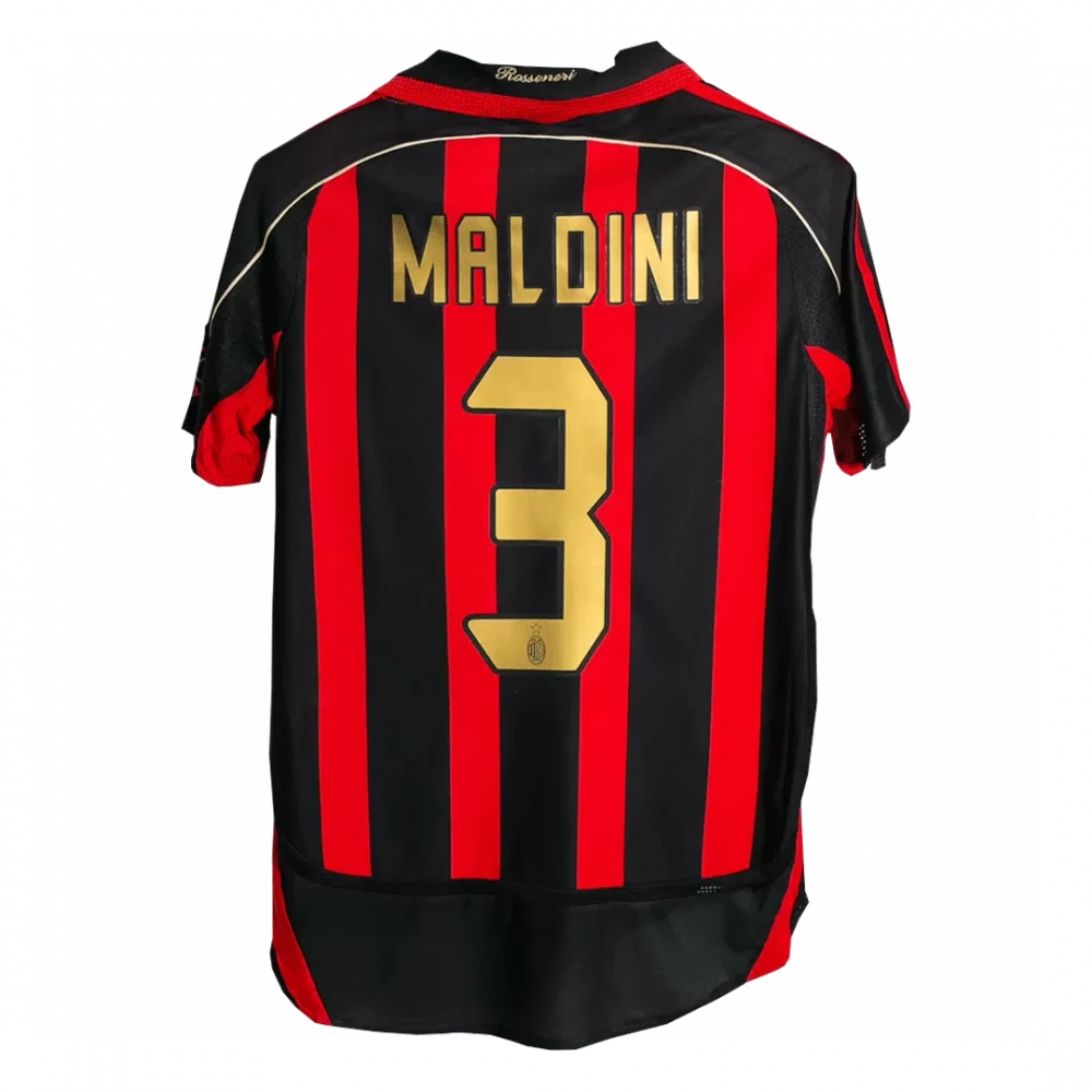 Step back into one of AC Milan’s most iconic seasons with this Vintage Soccer Jersey featuring the legendary Maldini #3. Bold red and black vertical stripes define the club’s fierce spirit, while gold detailing honors a symbol of defensive mastery and leadership that shaped Milan’s glorious history in 2006/07. Crafted for fans who appreciate both heritage and performance, this jersey blends timeless design with modern comfort.