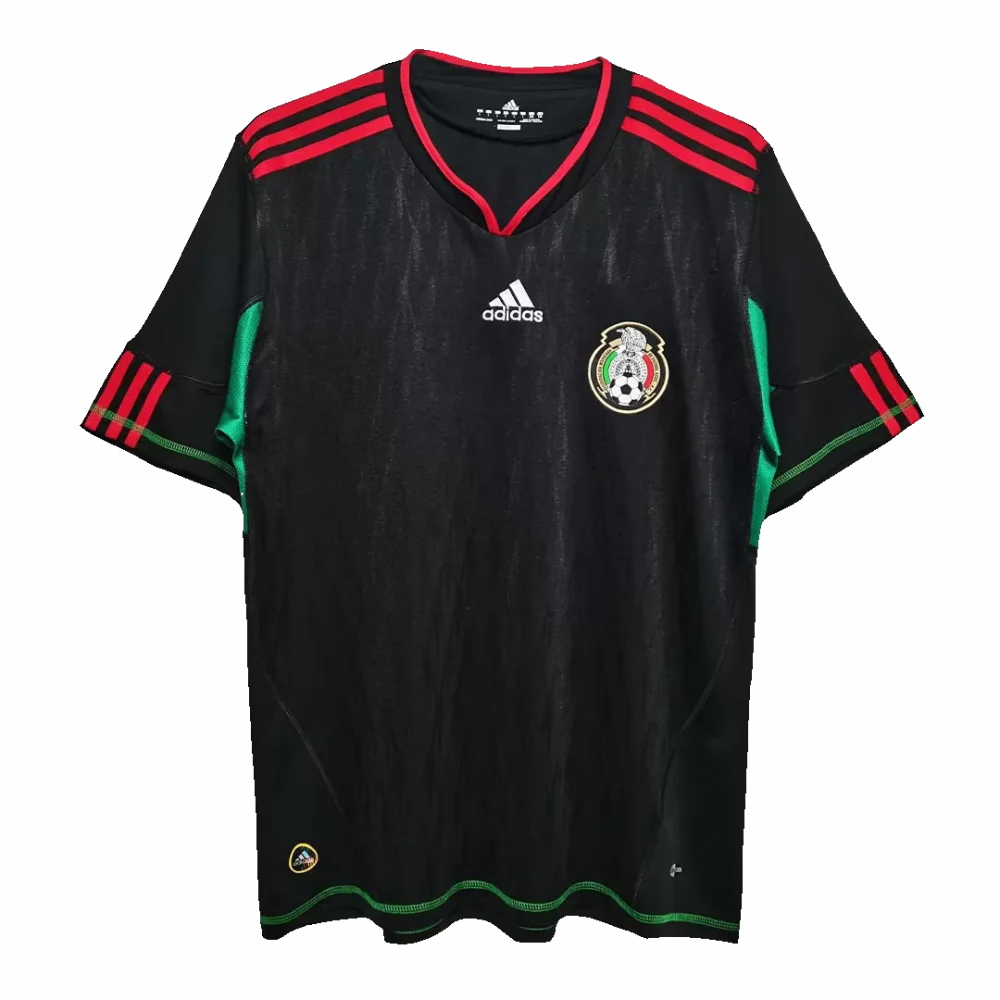 Step into the legacy of Mexican football with the Vintage Mexico Away Jersey from 2010. Featuring a bold black base with vibrant red stripes across the shoulders and subtle green accents along the sleeves and hem, this jersey captures the passion and pride of La Tri’s iconic away colors. The classic crest on the chest echoes decades of national pride, making this piece a true tribute to Mexico’s storied football history.