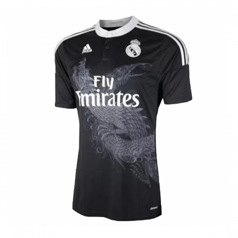 Step into the legacy of one of football’s greatest with the Vintage Real Madrid Third Away Jersey from 2014/15. This striking black kit features a subtle yet powerful dragon graphic that symbolizes strength and resilience—qualities synonymous with the Royal Madrid club. Accented with classic white details on the collar and shoulders, it captures the spirit of a team that commands respect on every pitch.