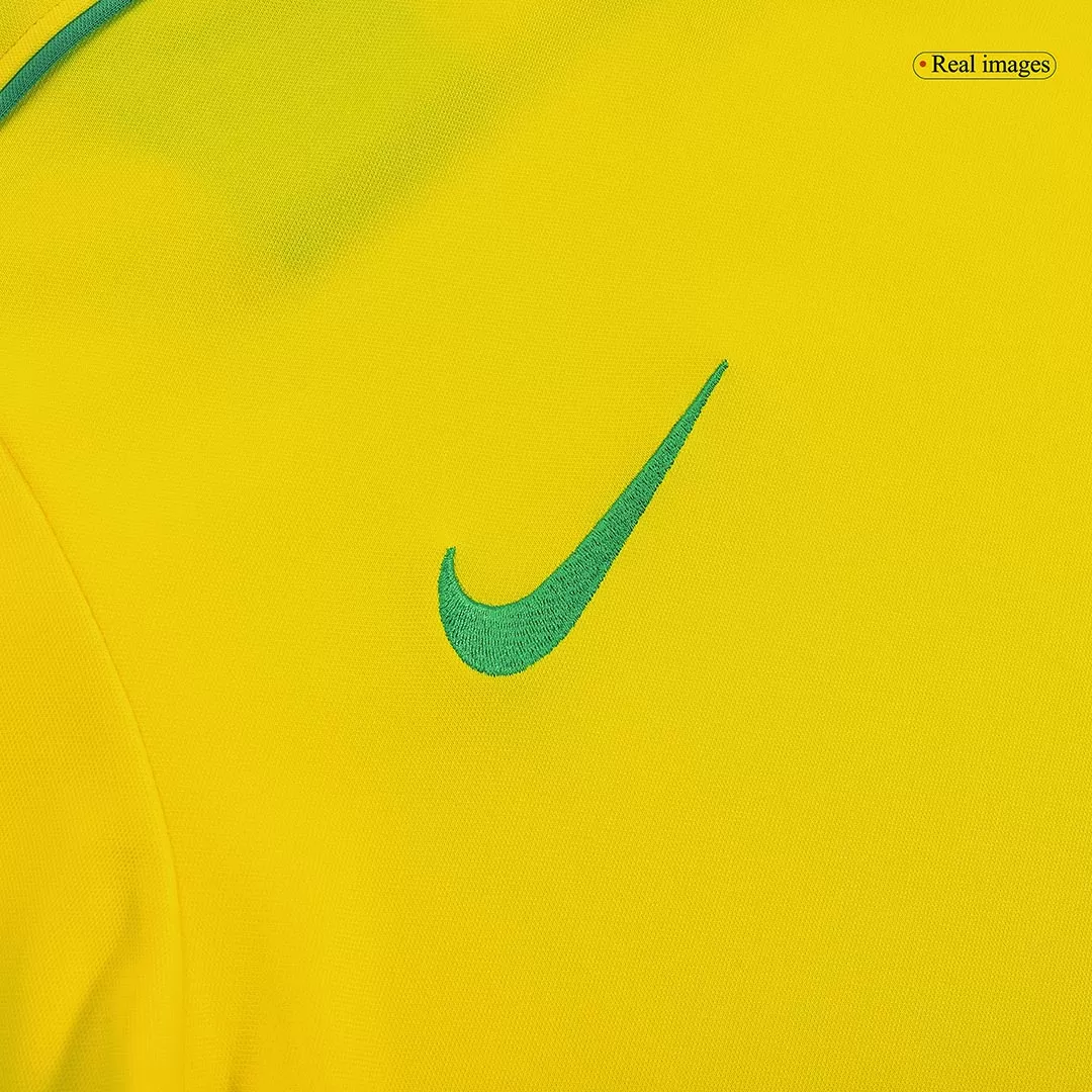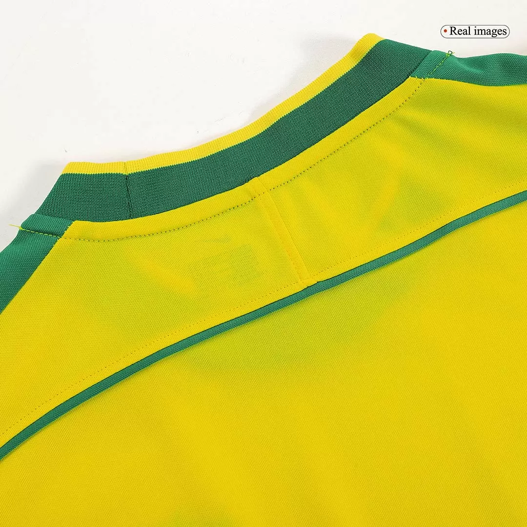 Step back into football history with the Vintage Soccer Jersey RONALDO #9 Brazil Home 1998. Featuring Brazil’s iconic bright yellow base contrasted with deep green trim on the collar and sleeves, this jersey captures the spirit of the Seleção during one of its most memorable eras. Celebrate the legacy of Ronaldo, whose skill and passion electrified the world stage, wearing a jersey that combines classic style with modern comfort.