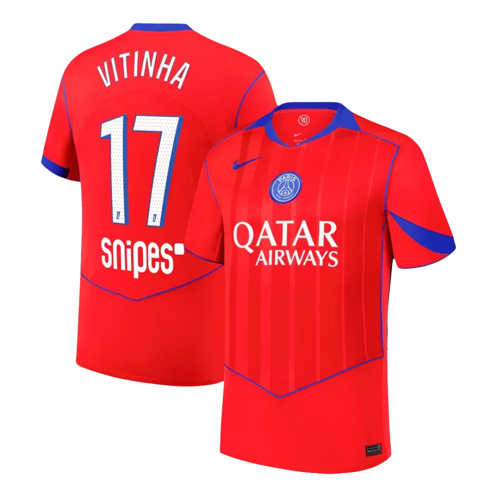 Step into the vibrant spirit of Paris with the VITINHA #17 PSG Third Away Soccer Jersey 2025/26. This striking red kit, accented with bold blue trim and subtle vertical stripes, pays homage to the club’s dynamic style and relentless passion on the pitch. Crafted for superior comfort and performance, it blends breathable, lightweight fabric with advanced moisture-wicking technology to keep you cool and dry during every match.